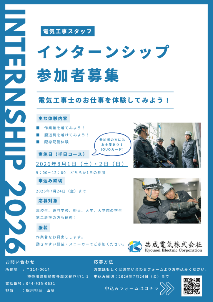 2026.04.9 電気技師インターンシップ募集中 会社見学 採用 社内イベント 電気配線や、電気配管など、電気工事技師のお仕事を体験してみよう! 日程(各日9:00〜12:00)どちらか一日 8月1日(土) 8月2日(日) 主な内容 作業着を着てみよう、腰道具を付けてみよう、配線配管練習、会社説明 動きやすい服装と、スニーカーでご参加ください。 お申し込みはこちら スキー・スノーボード旅行 前の記事